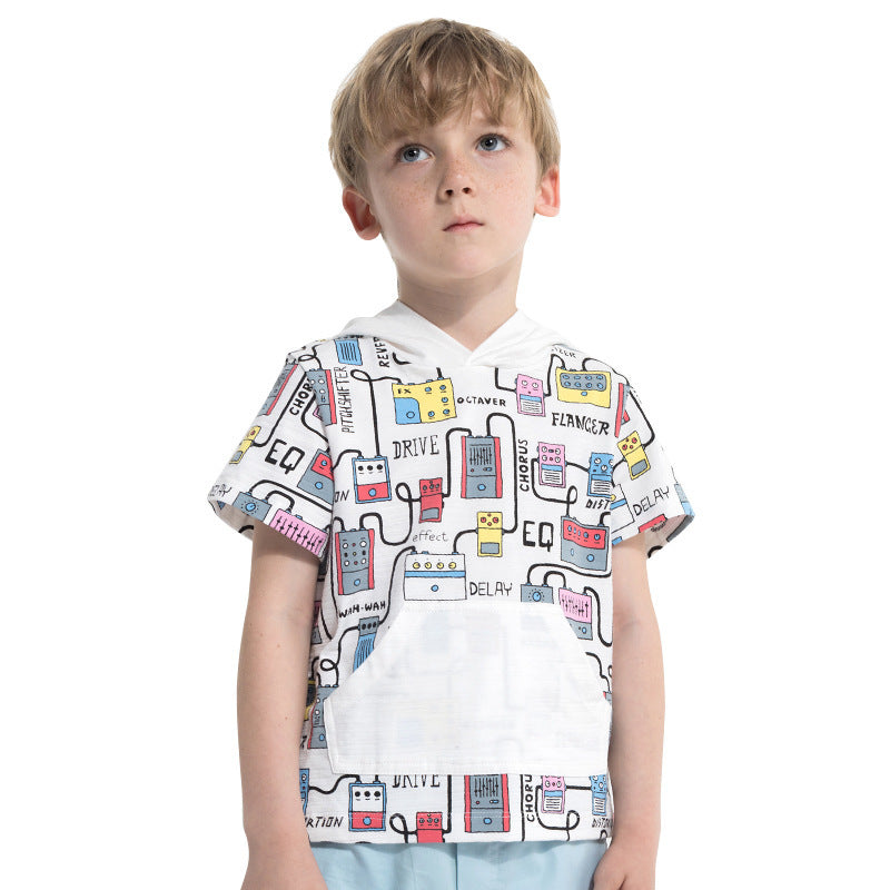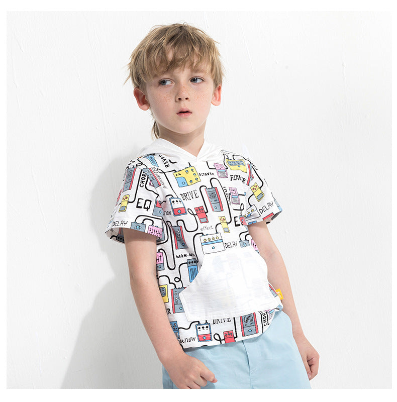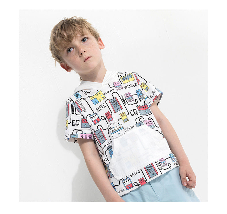 Cartoon print boy's hooded short sleeve t-shirt