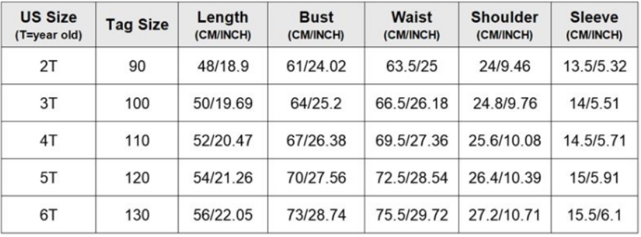 Size: 2T 90cm 3T 100cm 4T 110cm 120cm 130cm